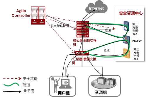 不仅支持将NGFW等安全设施虚拟为安全资源中心,还可开放接口支持第三方安全设备的集成;安全设备可多次被敏捷交换机调用,可同时被不同的敏捷交换机调用。